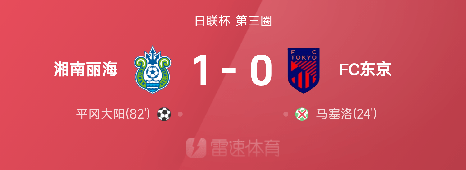 05月21日讯 25赛季日联杯第三圈,湘南丽海1-0战胜FC东京,平冈大阳第82分钟上演绝杀。全场比赛,平冈大阳破门建功,马塞洛失点。