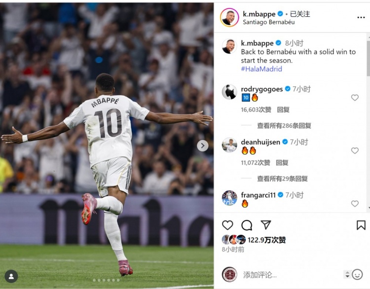 赛后姆巴佩在社交媒体发布进球庆祝照,配文道:"回归伯纳乌,用一场稳健的胜利开启新征途。"