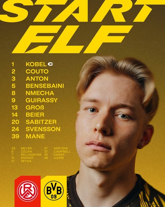 多特蒙德替补:33-迈尔、6-厄兹詹、7-乔布-贝林厄姆、10-布兰特、21-雷纳、27-阿德耶米、37-坎贝尔、42-卡巴尔、49-吕尔斯